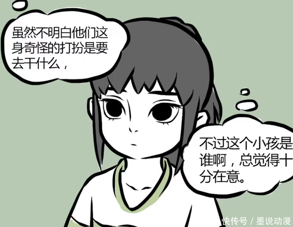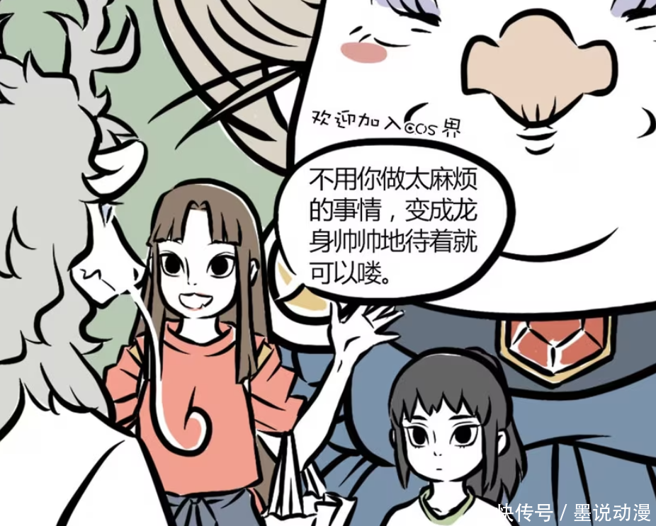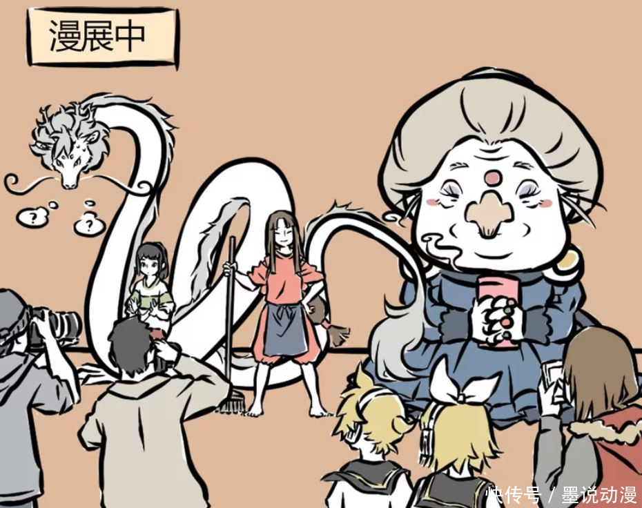 《非人哉》早期漫画中,哪吒和九月就很喜欢cos。不过这一次是敖烈受邀一起参加漫展,他不用cos谁,只要变成龙就可以。哪吒和九月都是cos千寻,只不过是不同服装的千寻。老肚cos汤婆婆,在妆容上也是用了点心思。